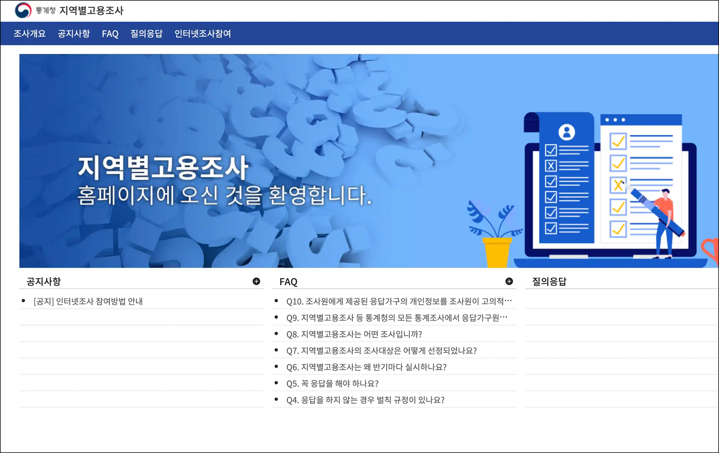 통계청 지역별고용조사 (survey.k-stat.go.kr/eregion) 2024년 10월 17일 로 fawnot 지역별고용조사 62회차서비스 점검 안내 해당 사이트는 K-통계 시스템의 일부로, 지역별 통계 데이터를 제공하는 플랫폼입니다. 사용자는 다양한 통계 조사를 통해 지역별 경제, 사회, 환경에 대한 데이터를 확인할 수 있습니다. 또한, 이를 통해 지역 간 비교, 정책 결정 등을 위한 통계 정보를 얻을 수 있습니다. 주로 정책 결정자, 연구자, 학생 등이 주요 사용자입니다.