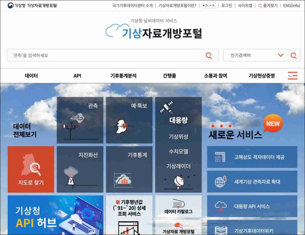 기상자료개방포털은 기상청에서 운영하는 공식 데이터 플랫폼으로, 우리나라의 다양한 기상·기후 자료를 누구나 조회하고 활용할 수 있도록 개방한 사이트입니다. 이곳에서는 날씨 관측값부터 기후 통계, 위성 자료, 레이더 영상, 예보모델 데이터까지 폭넓은 정보를 제공합니다.