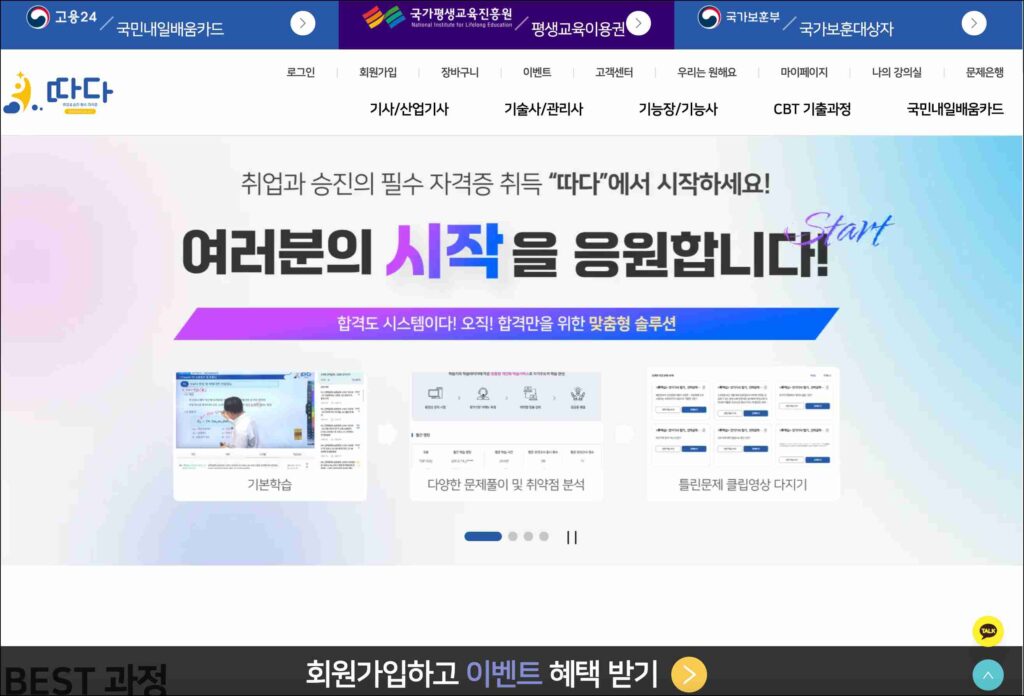 따다(웹사이트 ddada.co.kr)은 기술자격증 준비생들을 위한 온라인 학습 플랫폼이에요. 주로 전기, 기계, 소방설비, 산업안전, 위험물 등 기술 분야 자격증에 특화돼 있고 ‘실전 중심 학습 + 문제풀이 + 취약점 집중’이라는 학습 전략을 내세우고 있어요.