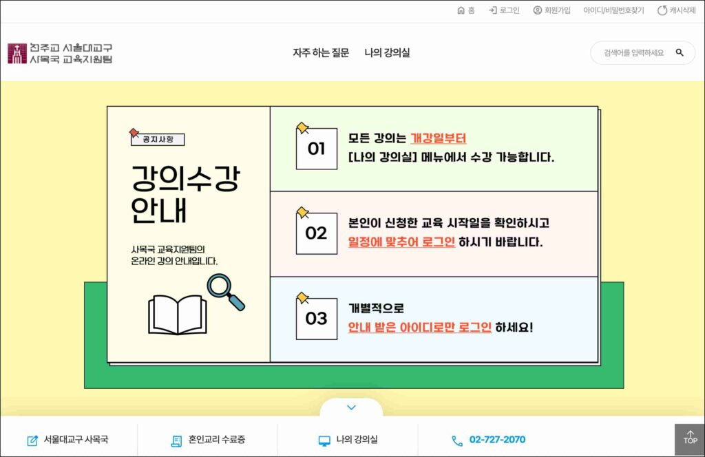 운영 방식은 간단합니다. 회원 가입 후 원하는 과정을 선택해 신청하면, PC나 스마트폰으로 바로 수강이 가능합니다. 본당이나 교구 단위로 지정된 대상자에게만 열리는 과정도 있고, 개별적으로 누구나 신청 가능한 공개 강의도 있습니다. 학습 진도는 자동으로 기록되어 관리자가 수강 현황을 확인할 수 있게 되어 있어요.