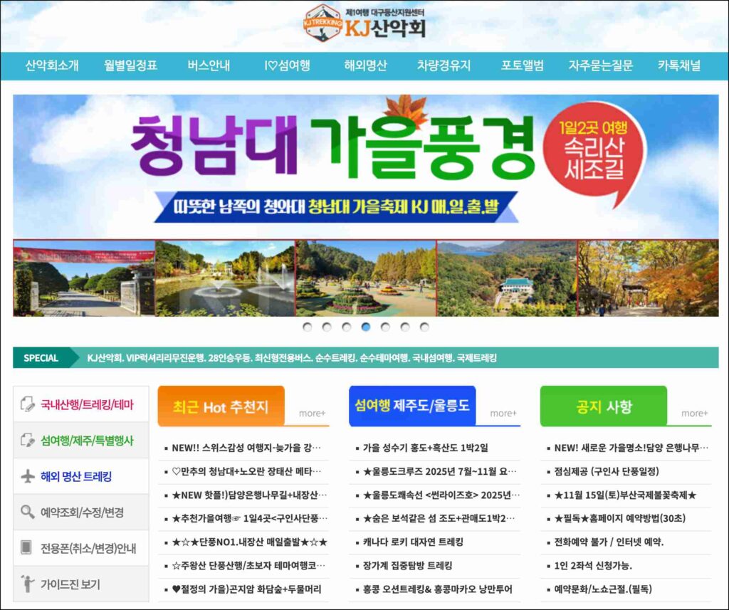 KJ산악회는 대구를 중심으로 활동하는 산악단체로, 국내 산행부터 해외 트레킹 여행까지 폭넓은 프로그램을 운영하고 있습니다. 단순히 등산을 함께하는 모임이라기보다, 여행사와 산악회의 성격을 함께 가진 곳이라 할 수 있습니다. 회원들은 주말이나 공휴일마다 전국의 산을 찾아가고, 봄에는 진달래와 철쭉 산행, 가을에는 단풍 산행, 겨울에는 눈꽃 트레킹 같은 계절별 테마를 즐깁니다.
