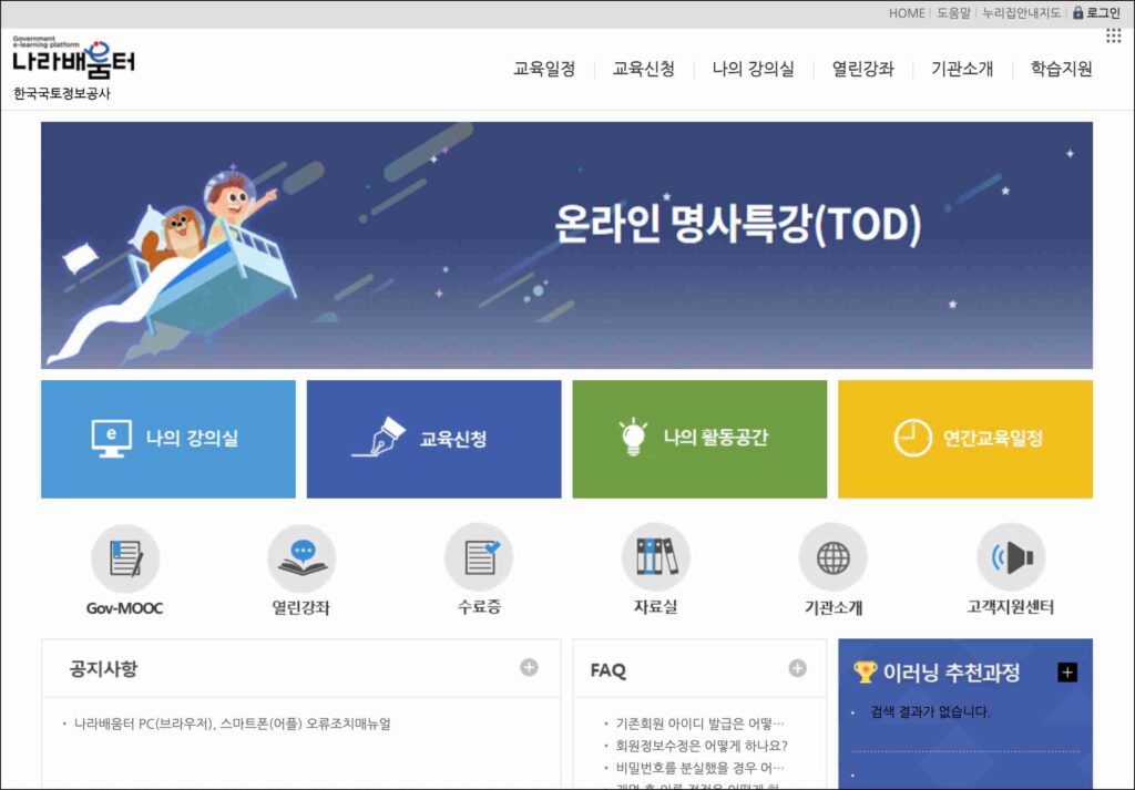 정리해보면 한국국토정보공사 나라배움터는 국토 정보와 공공 업무 전반에 필요한 교육을 온라인으로 제공하는 학습 플랫폼입니다. 시간과 장소의 제약을 줄이면서도, 직무와 연계된 학습을 이어갈 수 있도록 구성된 공간이라, 관련 업무를 하는 분들이라면 자연스럽게 접하게 되는 곳이라고 보시면 됩니다.