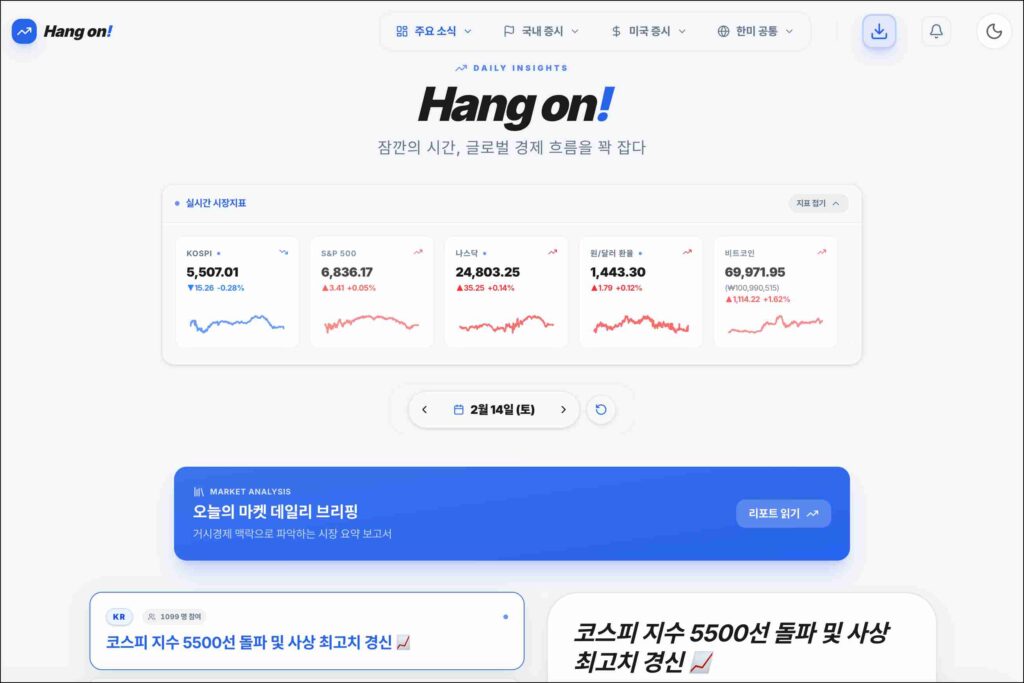 hangon.co.kr, 이름 그대로 오늘의 경제를 간단하게 정리해주는 사이트입니다. Hang on이라는 표현처럼, 바쁜 일상 속에서 잠깐 멈춰서 시장 흐름을 확인하라는 의미로 보입니다. 복잡한 경제 기사를 전부 읽기 부담스러운 분들을 겨냥한 구조입니다.