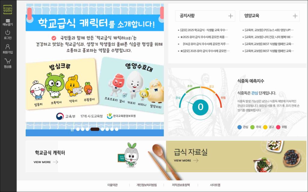 또 하나 특징은 식생활 교육 자료가 정리되어 있다는 점입니다. 영양 교육 자료, 위생 관리 안내, 식중독 예방 관련 정보 같은 콘텐츠를 제공하고 있습니다. 학교에서 활용할 수 있는 자료이기도 하고, 가정에서도 참고할 수 있는 내용들입니다.