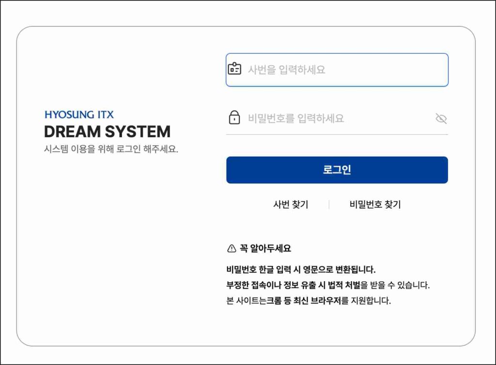 효성ITX는 IT 서비스와 솔루션을 제공하는 기업인데, 드림시스템은 그런 업무를 전산으로 처리하기 위한 통합 포털이라고 보시면 됩니다. 인사, 급여, 전자문서, 결재, 각종 업무 관리 기능 등이 포함되어 있는 내부 시스템 성격입니다. 회사 직원이나 협력사 관계자들이 로그인해서 사용하는 형태입니다.