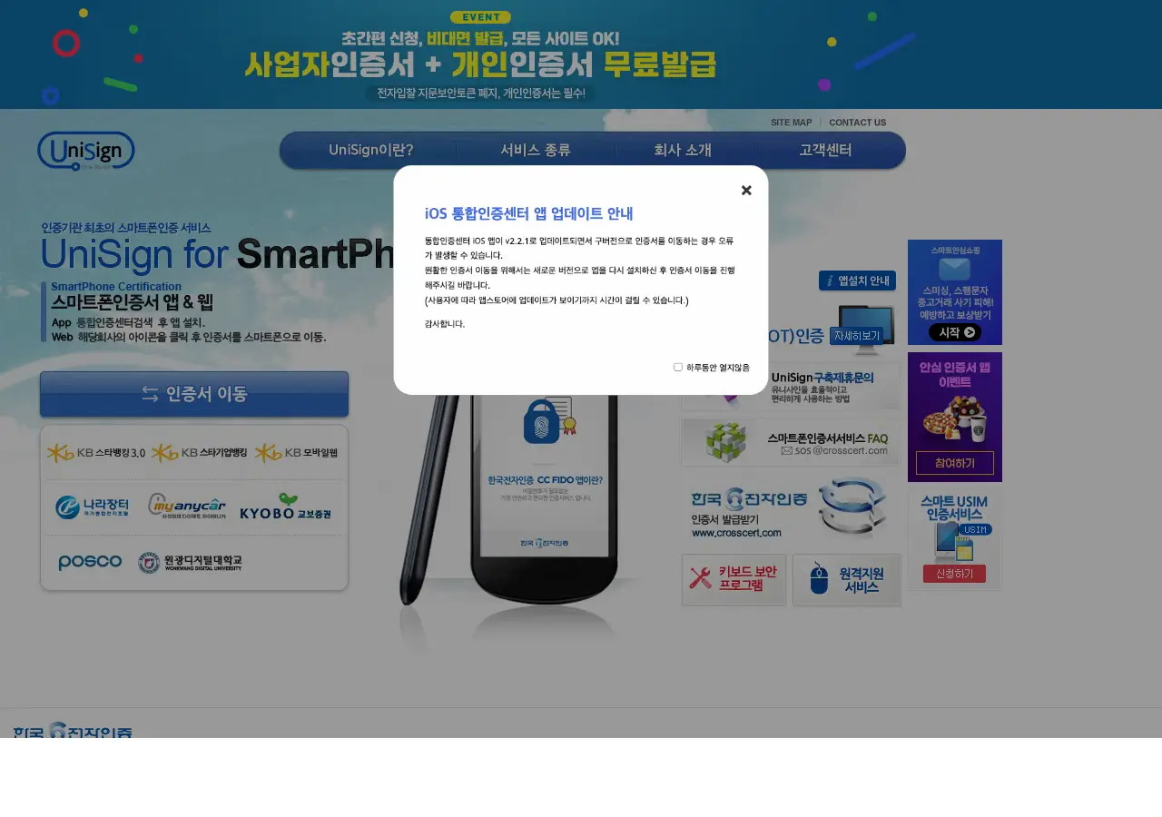 unisign.co.kr은 한국전자인증(CrossCert)이 운영하는 스마트폰 공인인증 서비스 ‘유니사인(UniSign)’의 공식 사이트입니다. 인증기관 최초로 스마트폰 기반 공인인증 서비스를 제공한 곳이에요.