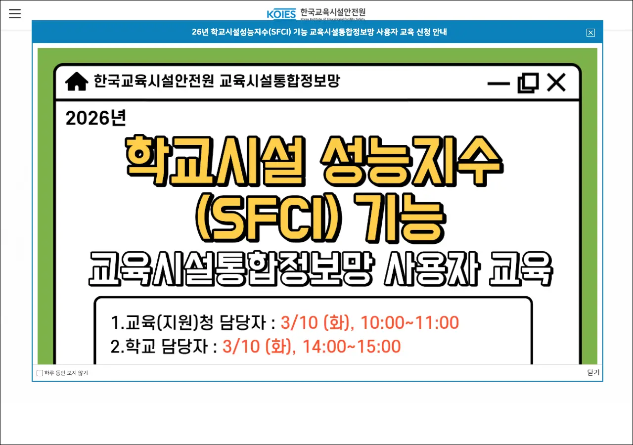학교 건물의 안전 점검이라는 게 사실 일반인한테는 잘 와닿지 않을 수 있는데요, 교육시설 관련 업무를 하시는 분들에게는 꼭 알아야 하는 사이트가 있어요. 바로 한국교육시설안전원의 교육 포털, edu.koies.or.kr입니다.