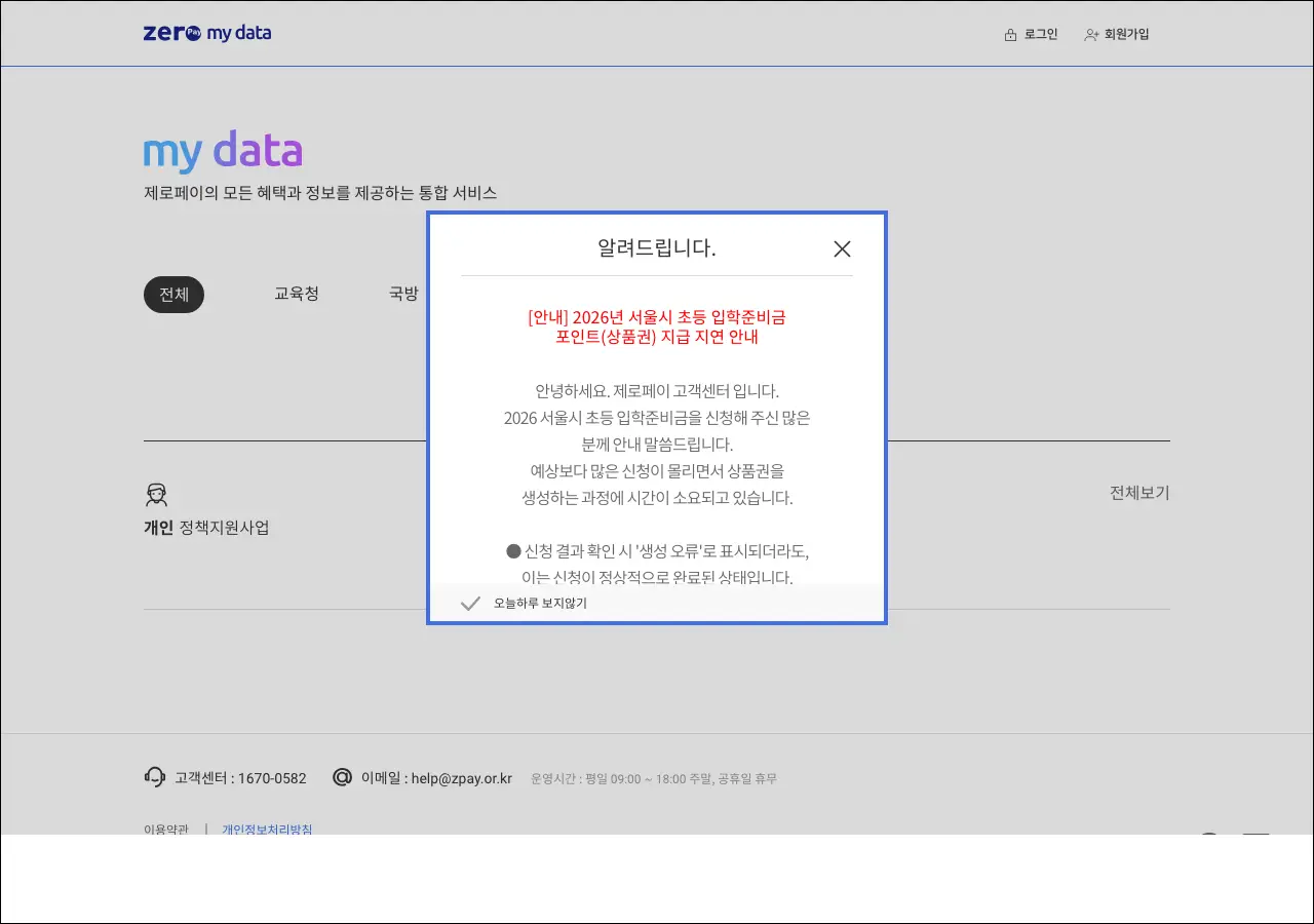 on.zeropaypoint.or.kr은 제로페이포인트 온라인 서비스 사이트예요. 서울시교육청 학부모활동비 같은 정책 바우처를 관리하는 플랫폼으로도 활용되고 있습니다.