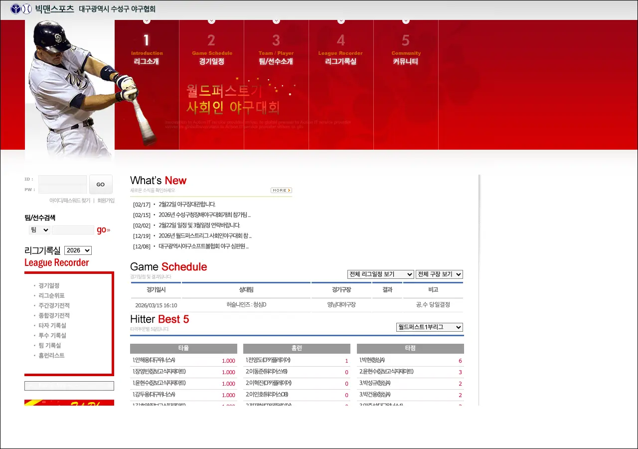 사회인 야구라는 게 프로가 아닌 일반인들이 참여하는 야구 리그나 대회를 말하는 건데요, 직장인이나 동호인 팀들이 주말에 모여서 경기를 하는 거예요. 대구 지역에서 야구를 즐기시는 분들한테는 익숙한 사이트일 거예요.