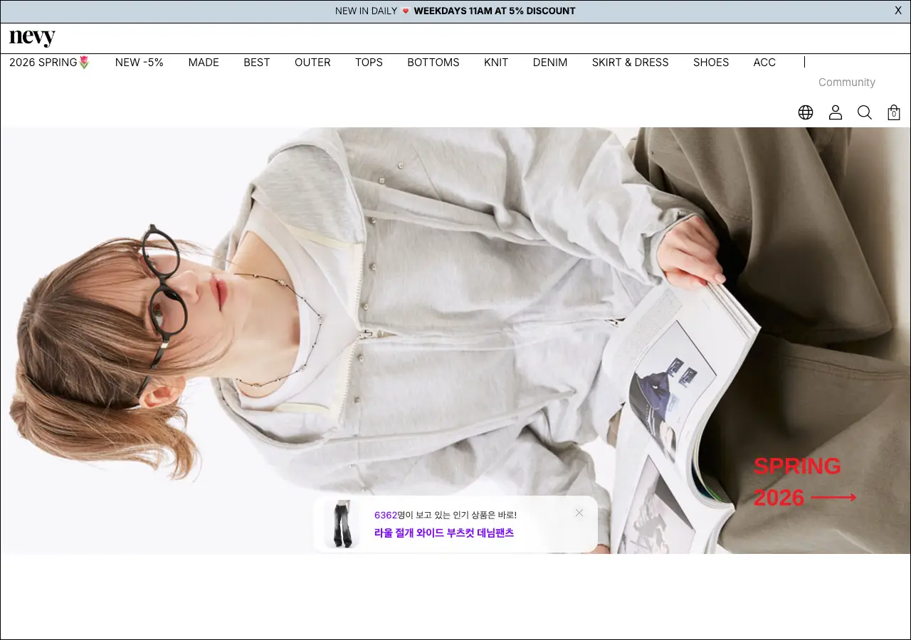NEVY는 여성 의류 전문 온라인 쇼핑몰인데요, 주식회사 사피엔스파크에서 운영하고 있는 곳이에요. 사이트에 들어가면 딱 봄 시즌에 맞춘 아이템들이 눈에 들어오는데, 아우터부터 탑스, 바텀스, 니트, 데님까지 카테고리가 꽤 세분화되어 있어서 원하는 스타일을 찾기가 편하더라고요.