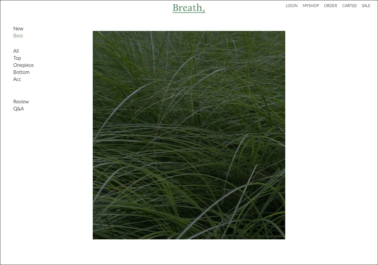 브레스는 심플하고 자연스러운 무드를 콘셉트로 한 쇼핑몰이에요. 사이트 이름 그대로 숨결이라는 의미답게 전체적으로 깔끔하고 담백한 분위기가 느껴지는데, 과하지 않은 디자인이 오히려 제품에 집중하게 만들어주더라고요. 의류나 패션 소품 위주로 구성되어 있는 것 같았어요.