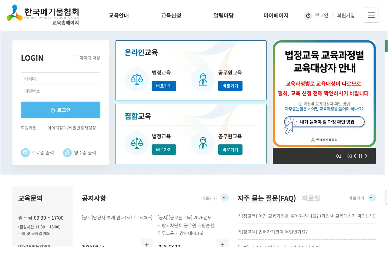 폐기물 관련 업종에서 일하시는 분들이라면 꼭 알아두셔야 할 사이트가 바로 한국폐기물협회 교육홈페이지예요. 폐기물 분야의 법정 의무교육을 온라인과 집합교육 두 가지 방식으로 운영하고 있거든요. 법에서 정해진 교육을 이수해야 하는 분들은 이 사이트에서 신청하고 수강하시면 돼요.