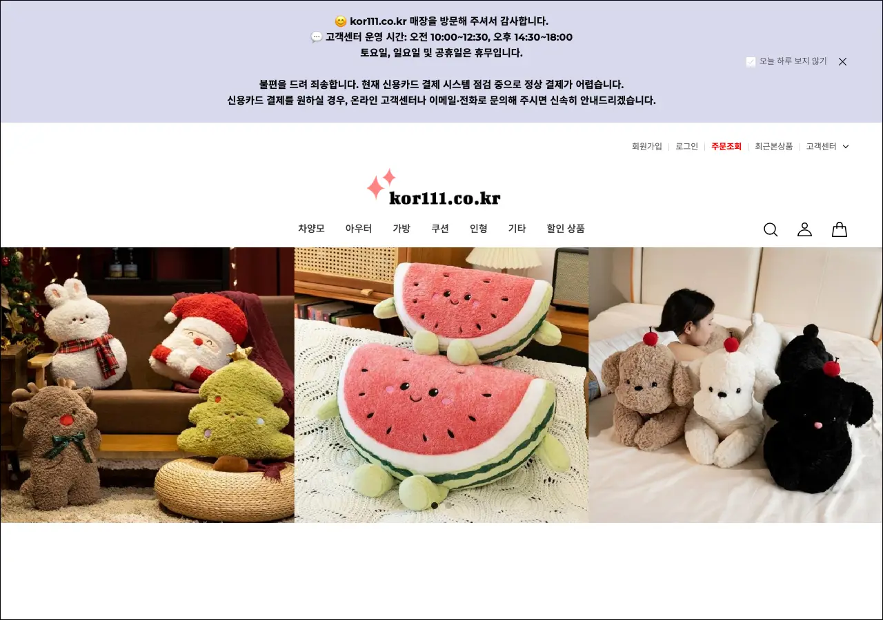 kor111은 카페24 기반으로 운영되고 있는 온라인 쇼핑몰이에요. 사이트에 접속하면 여러 카테고리로 나뉘어진 상품들을 둘러볼 수 있는데, 차양모나 아우터, 가방 같은 패션 아이템을 주로 취급하고 있더라고요.