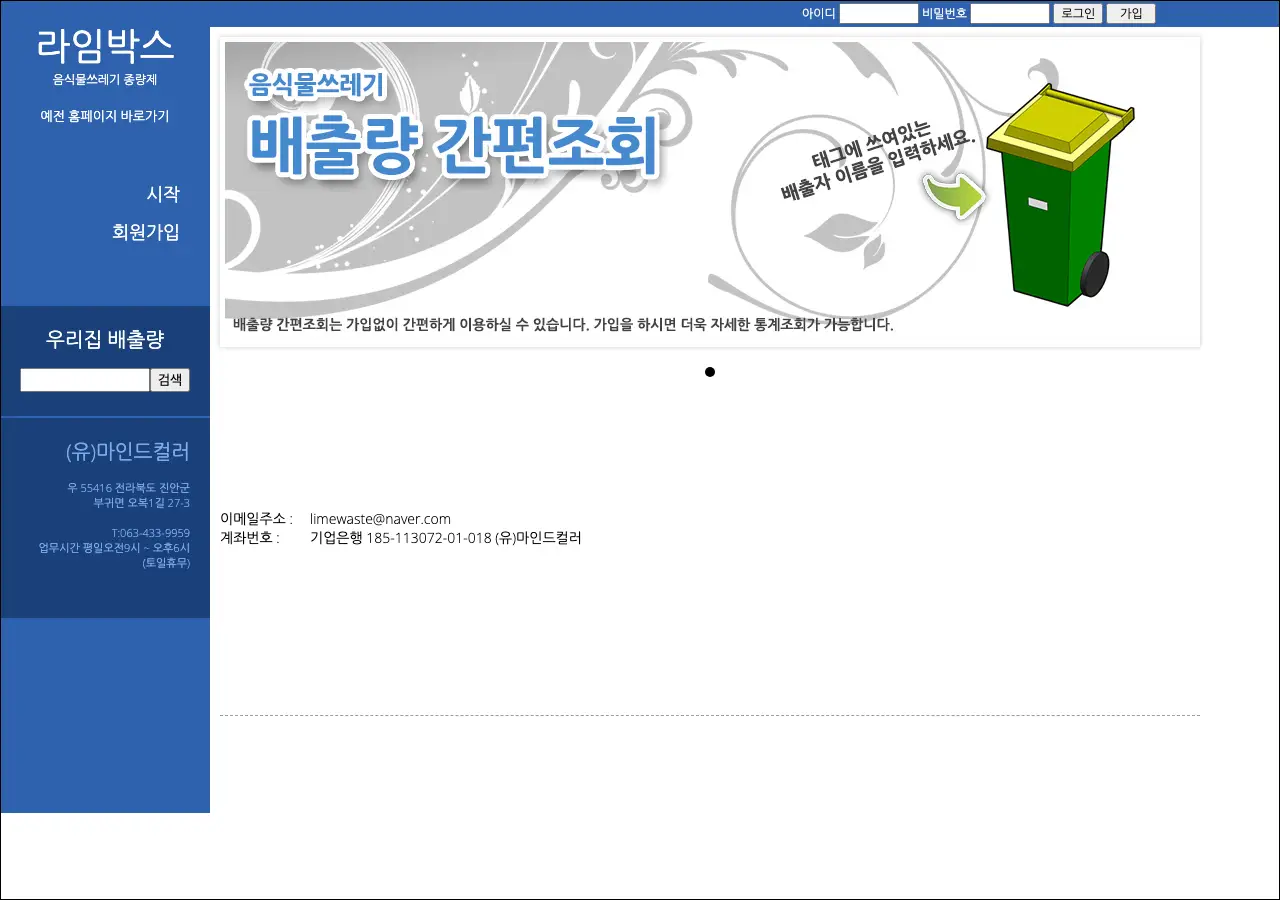 음식물쓰레기 버릴 때마다 은근히 신경 쓰이잖아요. 종량제 봉투 사야 하나, 무게로 따지나, 지역마다 기준이 다르니까 헷갈리기도 하고요. 라임박스라는 사이트는 바로 이 음식물쓰레기 종량제에 특화된 서비스를 운영하고 있는 곳이에요. 운영 주체는 (유)마인드컬러라는 회사이고, 전라북도 진안군에 본사를 두고 있더라고요.