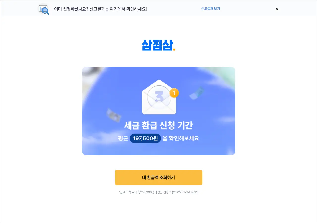 이 사이트는 믿고 받는 삼쩜삼, 내 숨은 환급액을 찾아보세요라고 소개하고 있는데요. 실제로 들어가 보면 깔끔하게 잘 구성되어 있어요. 필요한 정보를 찾기에도 편리한 구조더라고요.
