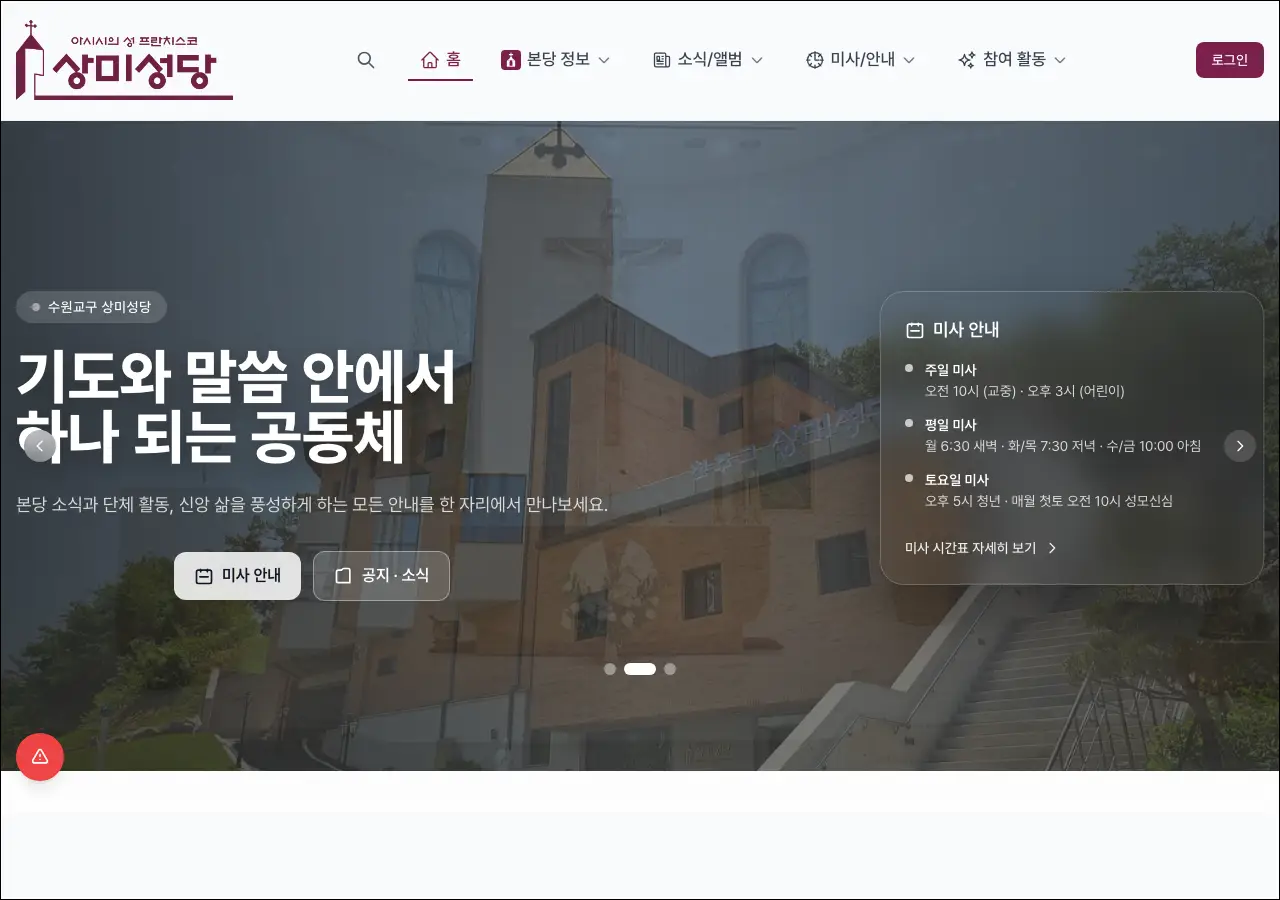 수원교구에 속한 상미성당의 홈페이지예요. 가톨릭 신자분들이라면 성당 홈페이지를 통해 미사 시간이나 성당 행사 일정 등을 확인하시곤 하잖아요.