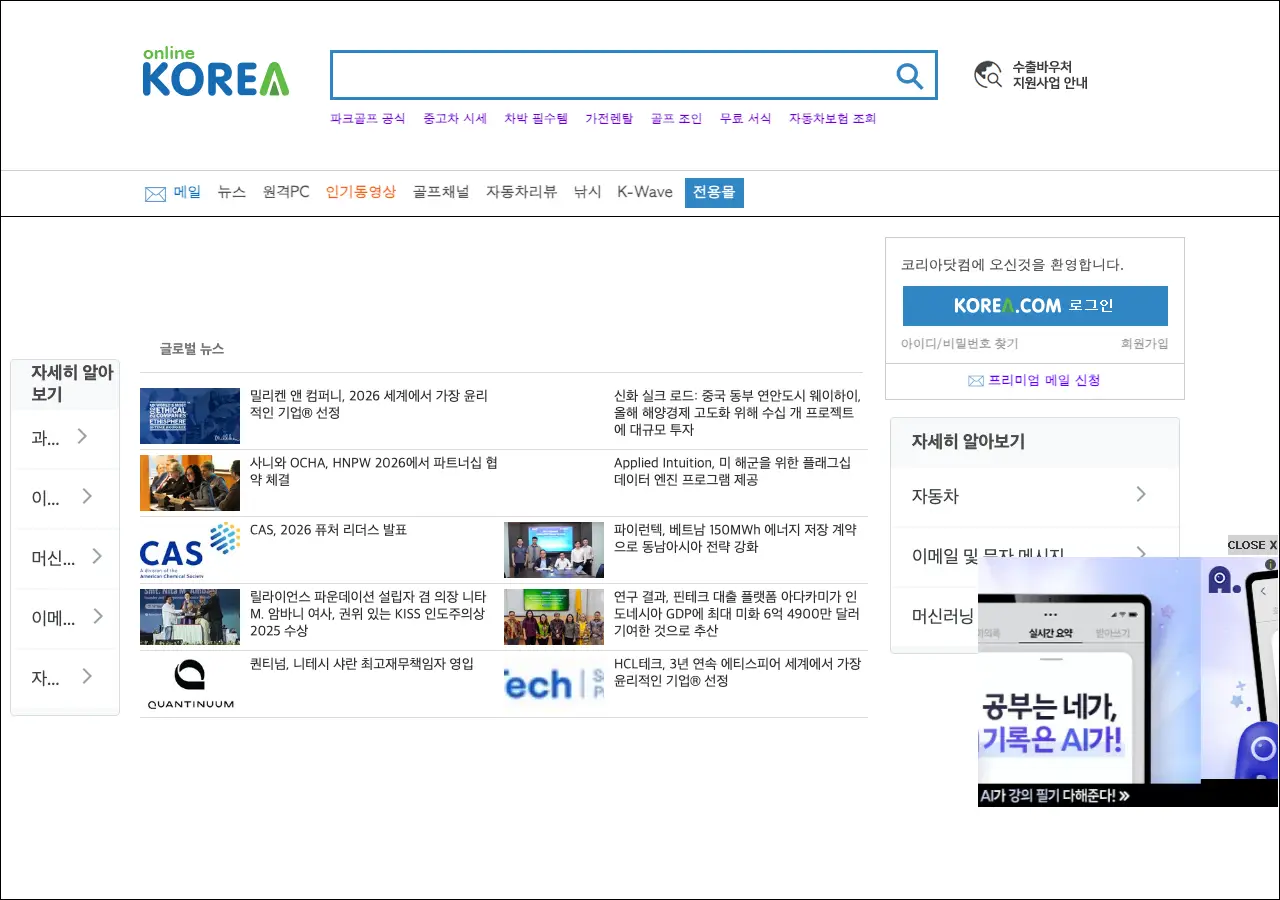 코리아닷컴은 한국 관련 종합 포털 사이트예요. 뉴스, 문화, 관광 등 한국과 관련된 다양한 정보를 제공하고 있고요. 이메일 서비스도 운영하고 있어서 korea.com 도메인의 이메일 주소를 사용할 수 있습니다. 한국에 관심 있는 해외 사용자나 국내 사용자 모두 이용할 수 있는 플랫폼이에요.