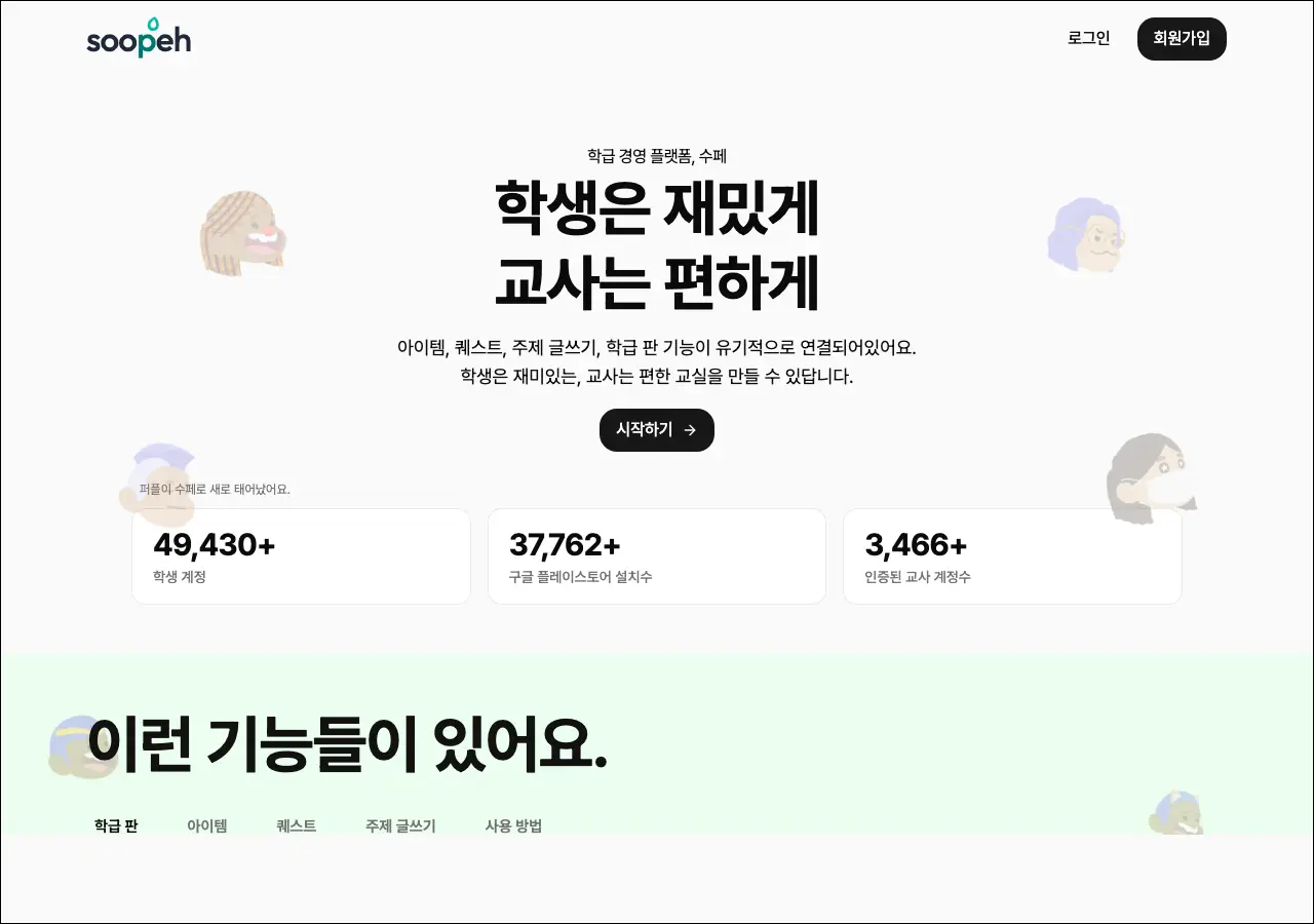 학급 운영하시는 선생님들이 출석이나 좌석 배치, 모둠 편성 같은 걸 관리하려면 은근 손이 많이 가잖아요. 수페는 그런 학급 경영 업무를 온라인으로 편하게 할 수 있도록 만들어진 플랫폼이에요. 초등학교나 중학교 담임 선생님들이 많이 활용하고 있는 서비스입니다.