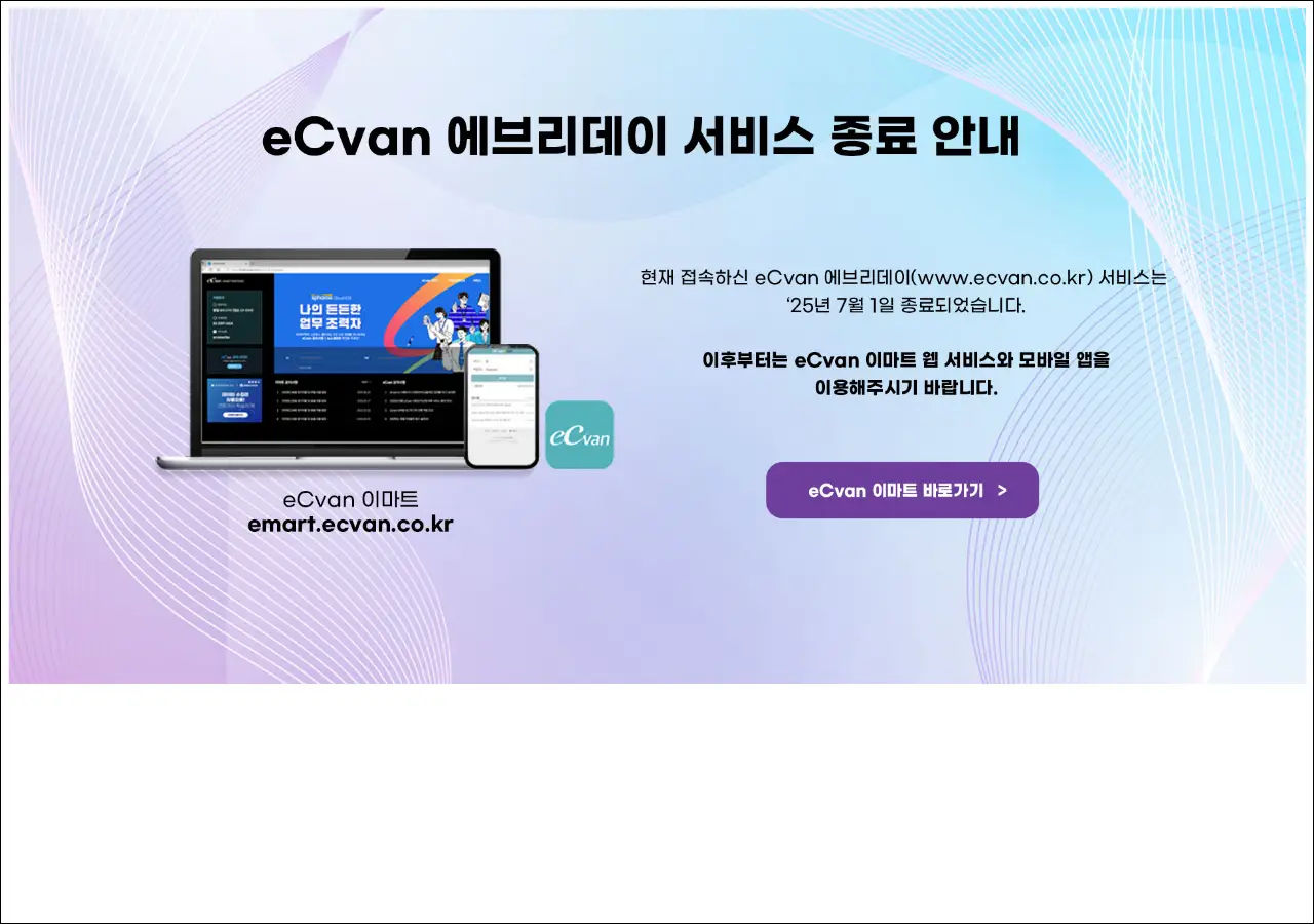 eCvan은 디지털 유통 시스템을 표방하는 사이트예요. 전자상거래 및 유통 관련 플랫폼으로 운영되고 있고, 이마트와 연계된 온라인 거래 시스템을 다루는 곳으로 보여요.