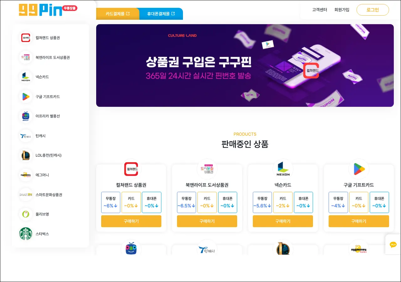 구구핀은 문화상품권을 온라인에서 구매할 수 있는 사이트예요. 컬쳐랜드 상품권을 카드결제나 휴대폰 결제로 살 수 있어서 편의점에 직접 가지 않아도 되는 점이 장점이에요.