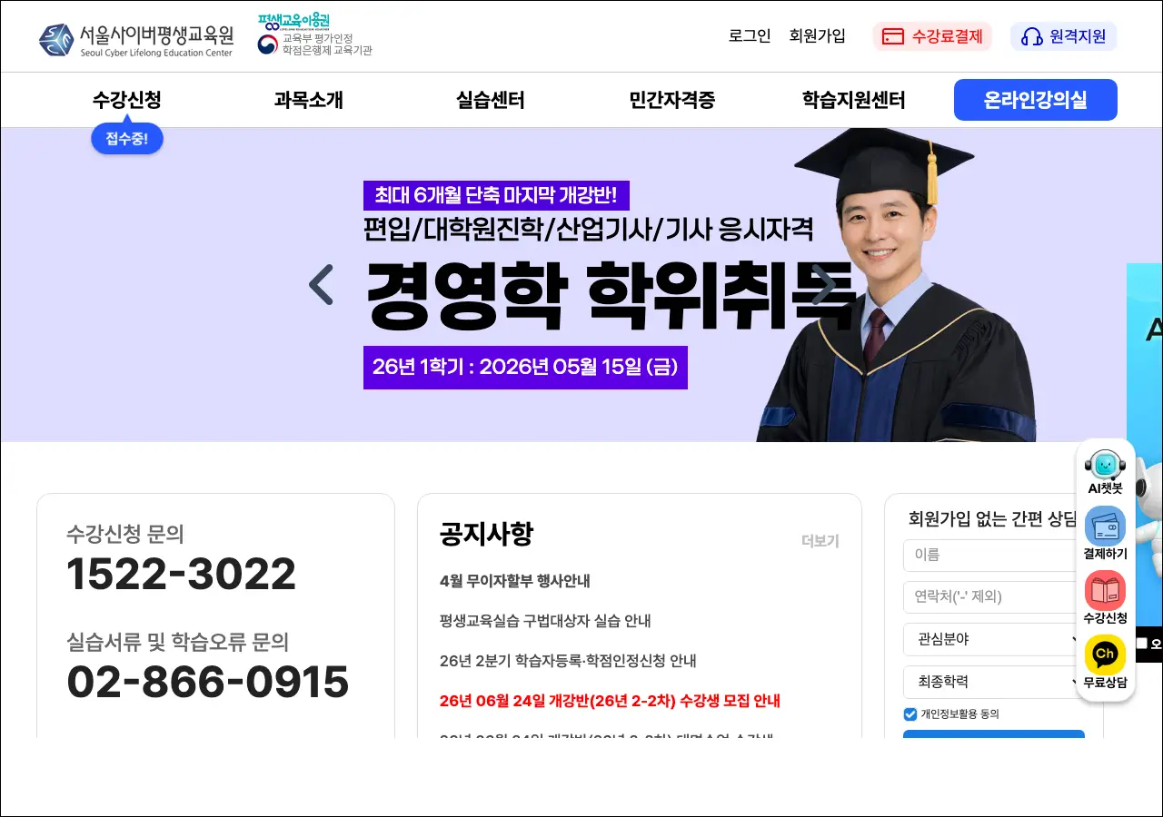 서울사이버평생교육원 홈페이지입니다. 사회복지사나 보육교사, 평생교육사, 건강가정사 같은 국가 자격 취득을 목표로 학점은행제 과정을 운영하는 원격 교육기관이에요. 직장 다니면서 야간에 자격증 하나 준비해보려고 알아보시는 분들이 많이들 찾는 곳인데, 수강 절차 안내부터 학습 설계, 수강료 결제까지 사이트 안에서 단계별로 정리해두고 있어서 처음 등록하는 사람도 흐름을 잡기 편하게 되어 있습니다.